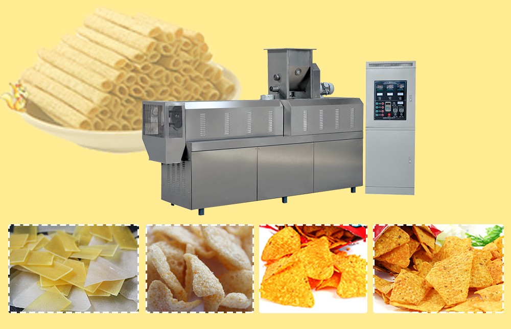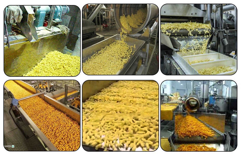 Fried Snack Production Line: Raw material mixing → Forming (extrusion puffing) → Low-temperature drying → High-temperature frying → Seasoning → Cooling and Packaging